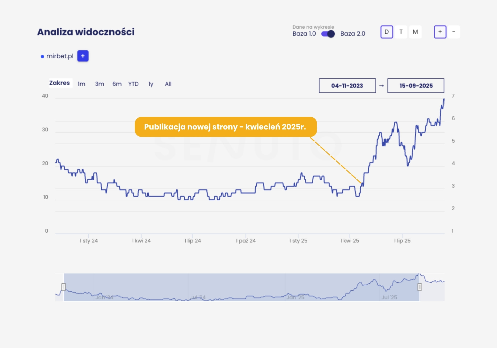 Źródło danych: analiza widoczności domeny mirbet.pl w Senuto (październik 2025).