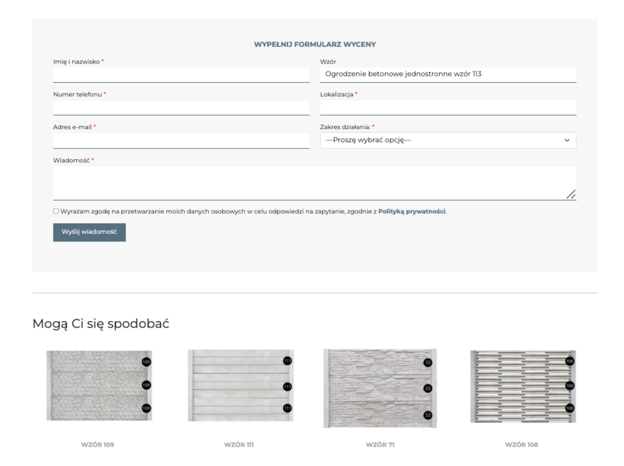 - przygotowaniu formularza wyceny powiązanego z konkretnymi wzorami ogrodzeń,